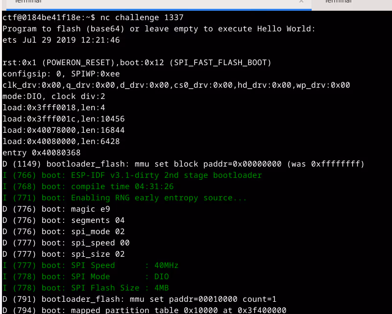 The challenge itself listens on port 1337, and executes run.py for each new connection.The run script is responsible for copying the original firmware in flash-base.bin to a new temporary file, asking the user for a base64 blob which will be decoded and written to the file at offset 0x20000 (thereby “flashing” our new application image), and will finally use QEMU to emulate it.
