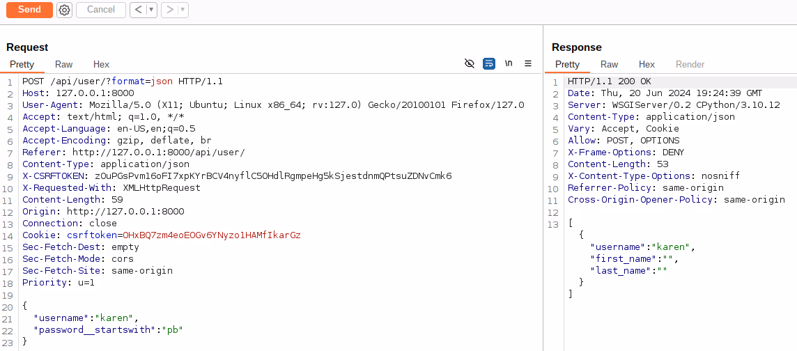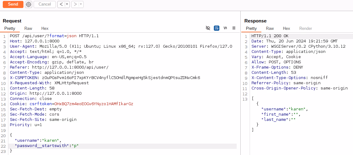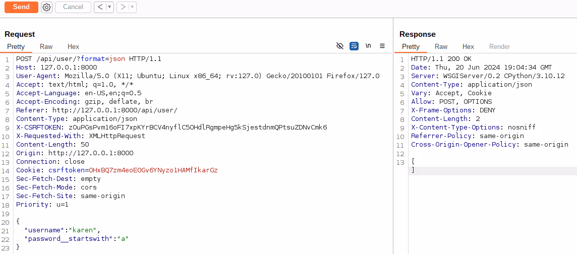 The one thing all of the previous exploit methods I have talked about in this article depended on was using the response length change as an oracle to determine when we had guessed the next correct character. There could be a scenario where Django code is vulnerable to ORM Leaks but the content length would not vary based on query results.