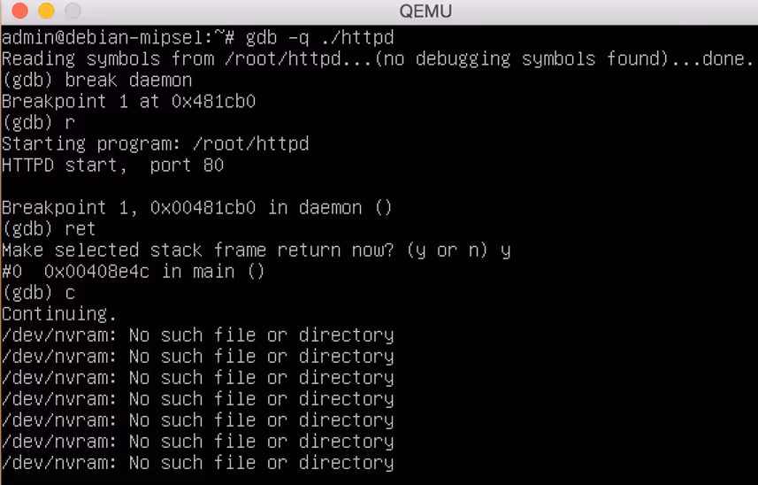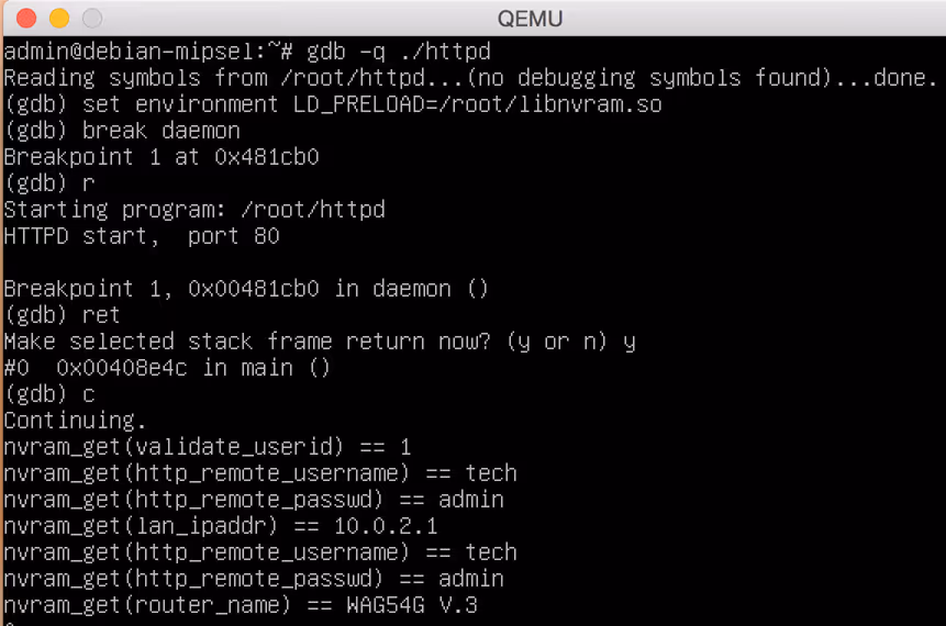 To ensure that our understanding of MIPS assembly was correct, it was necessary to perform runtime testing on the binaries and ensure our triggers lead to a crash. While this activity could have been done against the WAG54G device itself, we chose to use an emulated environment with full control over tools and debuggers. We achieved this by using QEMU.