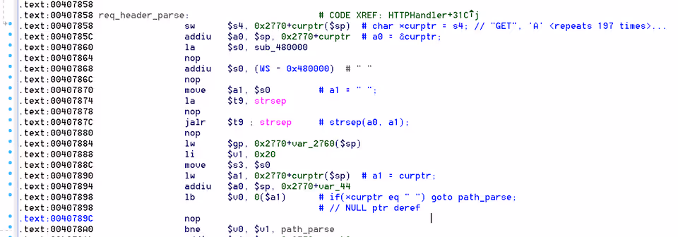 The following screenshot shows a fragment of code which parses an HTTP request, attempting to break apart the request method from the URI by calling the strsep() libc function: