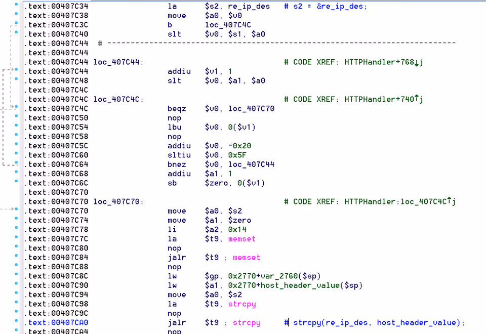 The next bug we came across was slightly more interesting. The code attempts to parse the Host: header while copying its value into the re_ip_des global char array. The problem is the use of strcpy() which performs an unbounded copy using an attacker supplied string, and the destination is of a fixed-length (~64 byte) buffer. By sending a large value in the header, an attacker can exploit this to overwrite other global variables on the heap - a construct which might be useful for privesc: